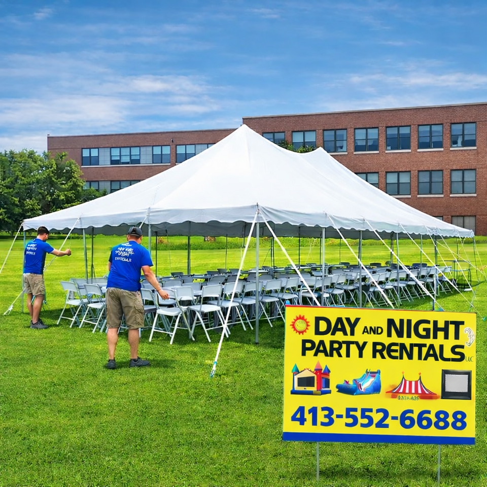 Space requirements depend on tent size, but you should always allow extra room around the perimeter for staking and safe anchoring. For example, a 20x40 tent requires more than just 20x40 of open yard. Springfield properties — especially in neighborhoods like Forest Park or Indian Orchard — may have fencing, trees, or slopes that affect layout. We recommend measuring your yard before booking so we can confirm the best fit.